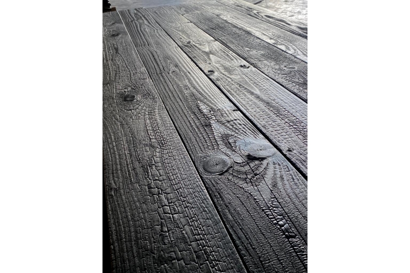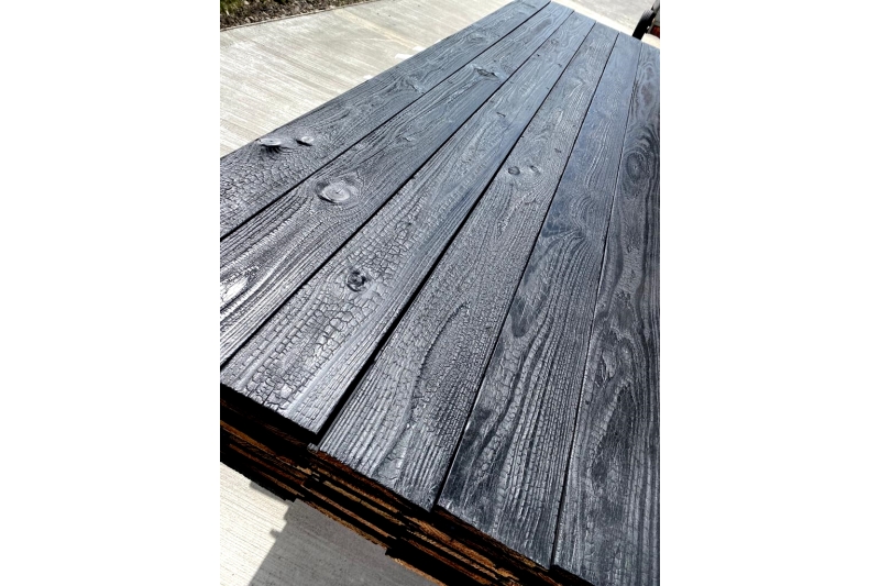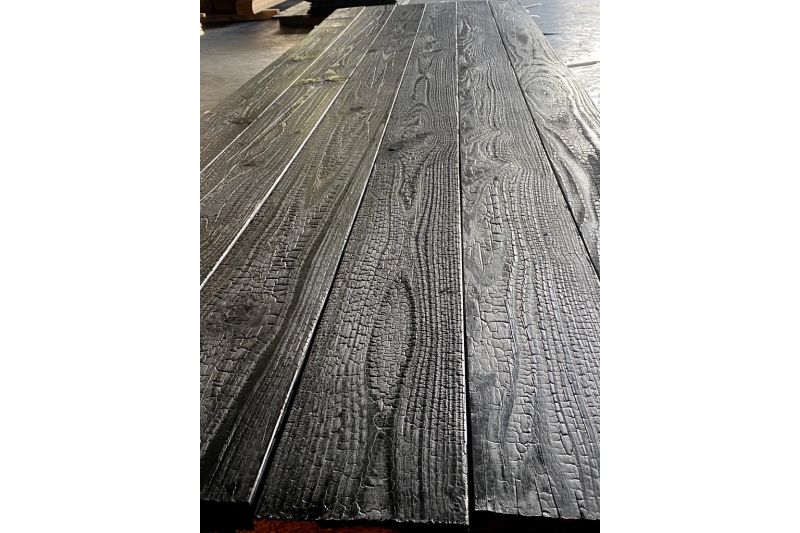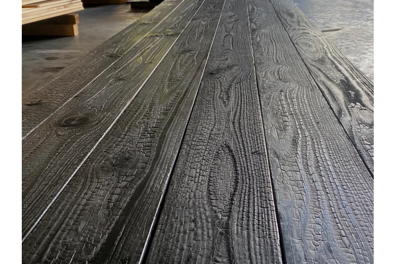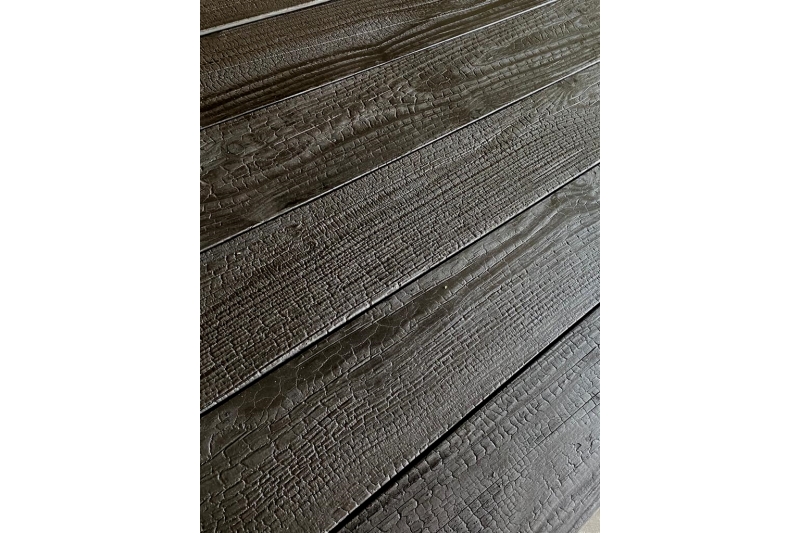 Inspire de la technique japonaise Shou Sugi Ban, chaque lame revele une texture unique dite "peau de crocodile", veritable signature visuelle pour vos projets architecturaux.